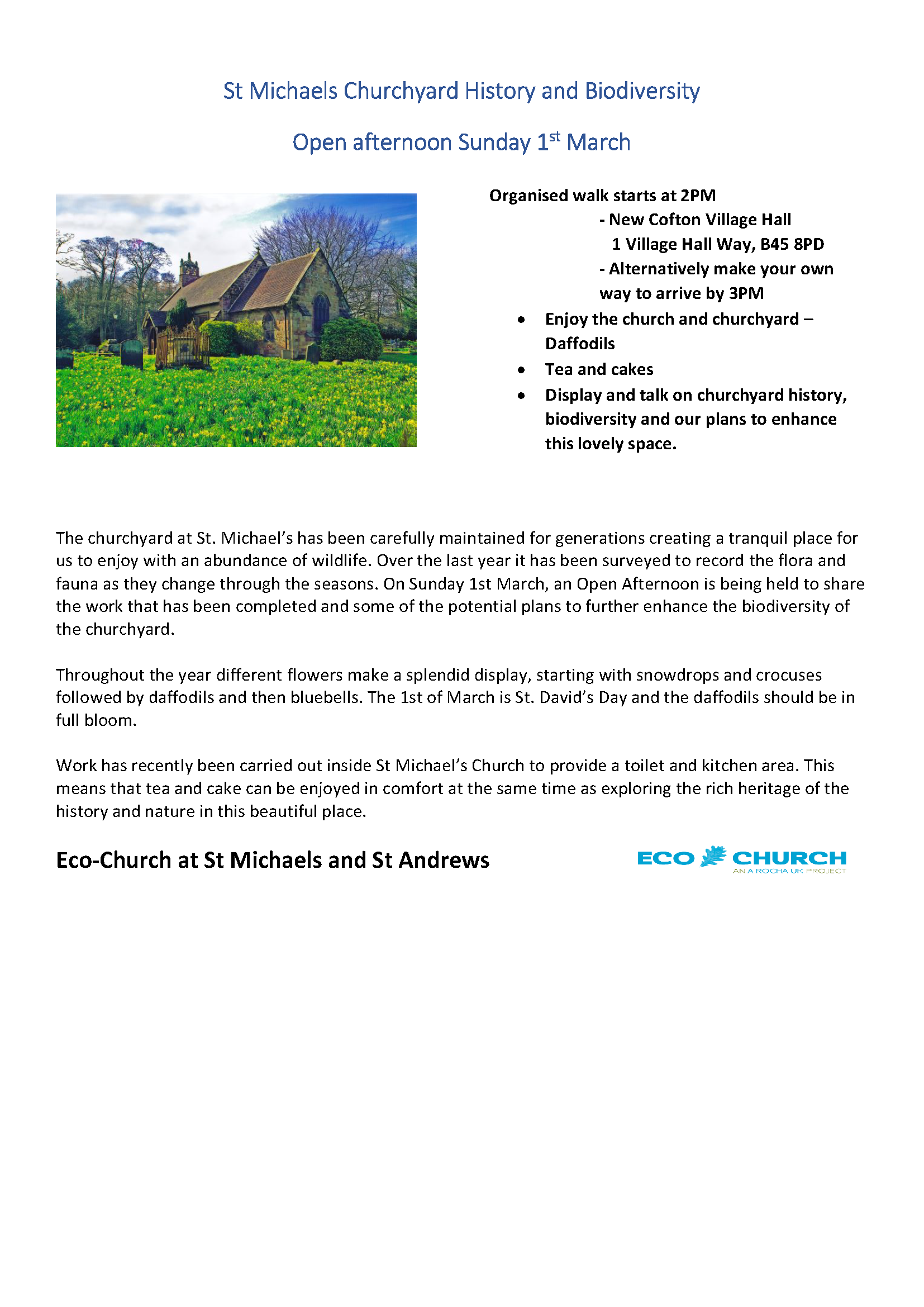 « All Events This event has passed. « Ordinary Parish Council Ordinary Parish Council » St Michaels Churchyard History and Biodiversity Open afternoon March 1st, 2020 - 2:00 pm - 5:00 pm Add to calendar Google Calendar iCalendar Outlook 365 Outlook Live Details Date: March 1st, 2020 Time: 2:00 pm - 5:00 pm Organiser ECO Church Venue St Michaels Church